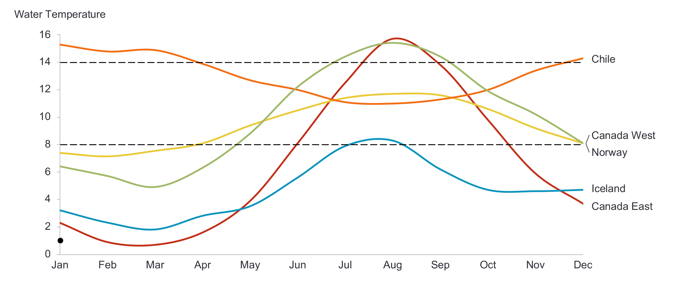 Together with optimized nutrition, temperature is a primary growth driver for salmon. Salmon will grow at a range of temperatures, but growth will slow if the water is too cold or too warm.